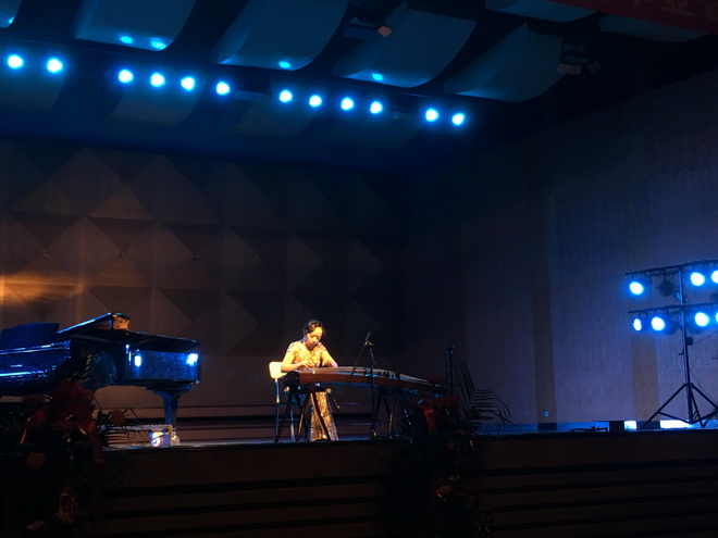 音乐会分为上下两场,共有七首筝曲。上半场是富有国家民族韵味的三首经典筝曲――《汉江韵》、《将军令》、《姜女泪》。有的振奋人心,有的催人泪下,观众们都被深深打动。经过短暂的休息后,下半场开始了,一曲《林泉》仿佛把人们带入泉水世界,身边似有林泉涌入。接着,本场音乐会的唯一一位嘉宾与段欣妤一起表演一曲《云裳诉》,钢琴与古筝的的结合融入了众多现代因素,也是与西方文化的融合。《箜篌引》紧接着流入观众的耳朵,大气磅礴。最后一曲钢琴与古筝二重奏《山水》华丽轻巧,音乐会圆满结束。(设计与艺术学院 田晨瑞)