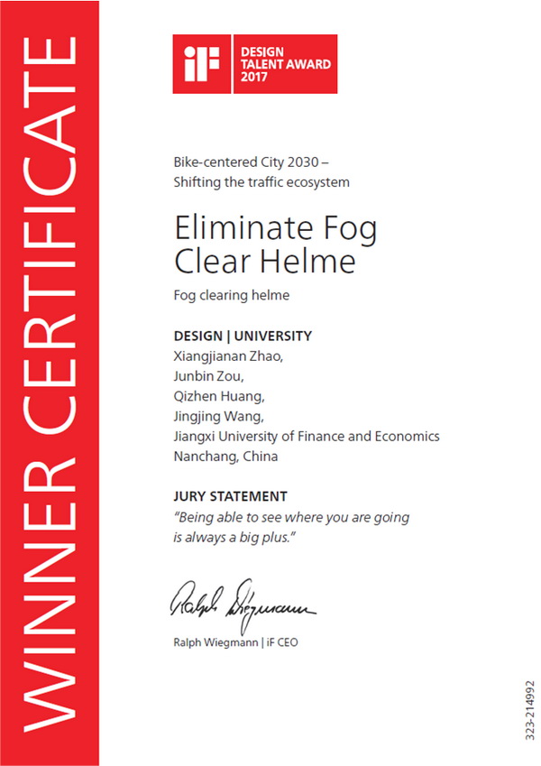 近日,德国iF奖获奖名单揭晓,我院2014级产品设计班学生赵向佳楠设计的作品――“Eliminate Fog ・ Clear Helmet”在众多参赛作品中脱颖而出,最终斩获2017德国iF设计新秀奖(iF DESIGN TALENT AWARD 2017)。这是继2015年、2016年设计与艺术学院学子获得德国红点奖、iF设计新秀奖之后,连续第三年获得国际设计竞赛大奖。此次设计竞赛由设计与艺术学院教师罗时武、况宇翔共同组织和指导。