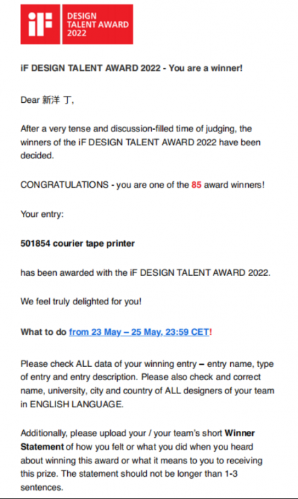 近日,德国iF设计奖(iF DESING TALENT AWARD 2022)获奖名单揭晓。在艺术学院教师况宇翔、柳腾芳的指导下,产品设计专业学生丁新洋、刘迎洁、方楚煜、张江豪团队的设计作品《COURIER TAPE PRINTER》荣获2022年德国iF设计新秀奖;方楚煜、王君、李家格、杨文丽团队的设计作品《ICEBREAKERS-SKI AREA CLEANER》获得本届大赛top300。