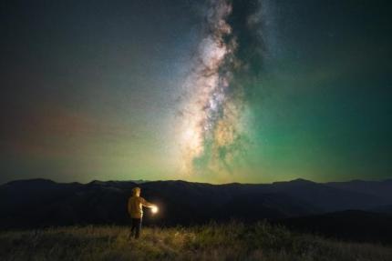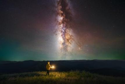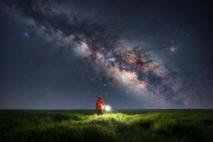 【作品简介】:这张照片拍摄于三月份的鄱阳湖(农历十一),使用了时间合成。前期通过“巧摄”APP前期模拟,得知月落是凌晨四点,所以实际拍摄银河的时间只有一个小时。当月亮还没落下的时候,月光是一个十分理想且均匀的补光光源,可以微微打亮地面从而让环境不那么黑,然后我走到前方提灯15秒不动,等到后半夜月亮刚好从地平线落下,银河升起后单独对银心部分累积拍摄50张,后期通过Sequator软件进行叠加,最后将地面和天空拼合到一起。当然,我在暑期使用天文改机后呈现的画面会更自然一些。