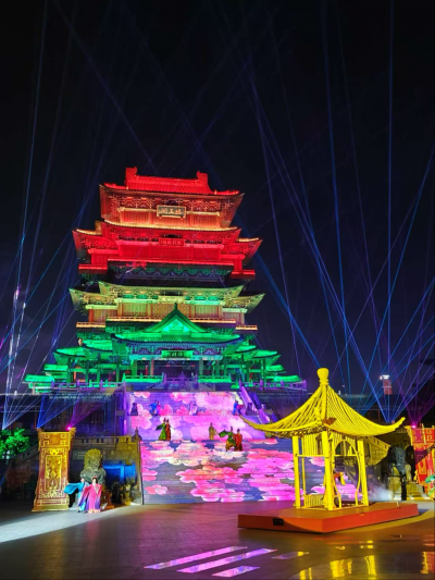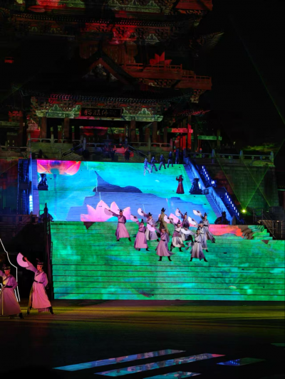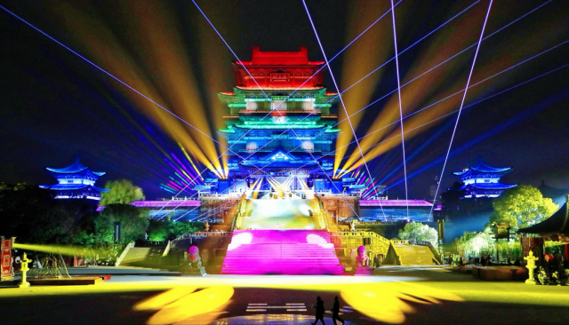演出以滕王阁为天然背景,巧妙地运用了现代科技与传统文化相结合的方式,生动地再现了滕王阁的历史故事与文化精髓。当灯光亮起,音乐响起,瞬间就将观众带入了一个梦幻般的世界。整个演出根据滕王阁“明三暗七”的建筑结构特点,让我们在不同的场景中感受到滕王阁的前世今生。从滕王阁的兴建,到历经岁月的沧桑变迁,再到如今的辉煌重现,每一个场景都如同历史的画卷在眼前徐徐展开。