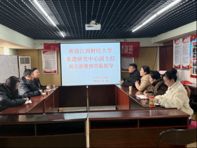 2024年12月24日,江西财经大学设计与艺术学院、校非遗研究中心副主任韩玉澎同志莅临宜黄县文化馆进行实地非遗音乐文化项目考察调研工作,期间,宜黄县文旅局二级主任科员、非遗传承人邓华,宜黄县文化馆负责人占选凤,文化馆副馆长邓淑玲、吴燕敏等人列席会议。本次调研会议围绕以下几点展开: