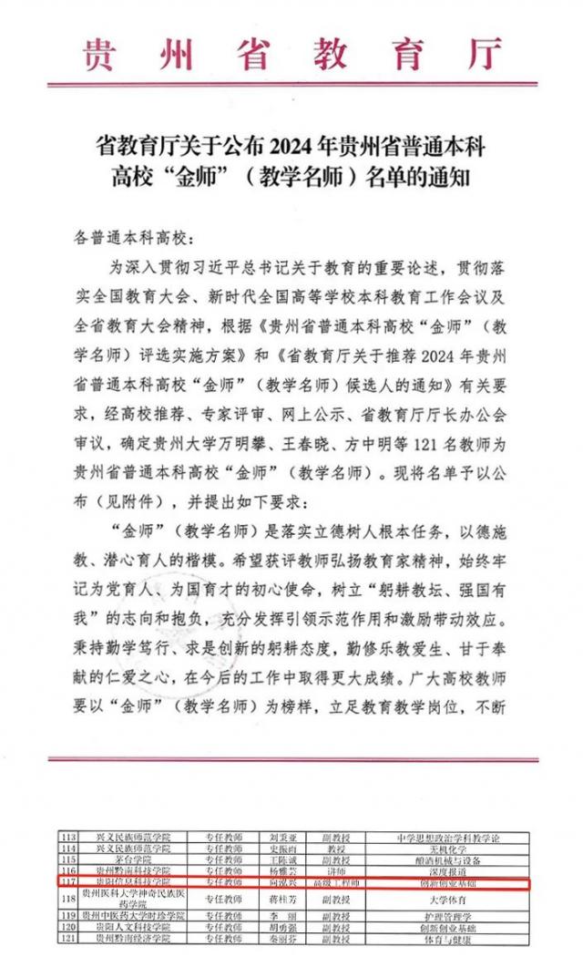 近日,设计与艺术学院优秀校友向泓兴在2024年贵州省普通本科高校“金师”(教学名师)评选中脱颖而出,成为全省121名“金师”(教学名师)之一!