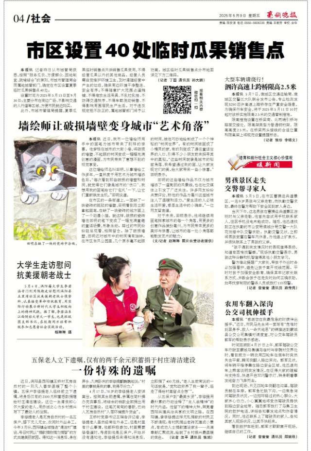 近日,我校音乐系李若涵同学在“五▪四”青年节之际,积极参与社会实践活动,走访慰问了抗美援朝老战士侯登科爷爷,并荣登中共亳州市委机关报《亳州晚报》。用实际行动传承和弘扬抗美援朝精神,展现了新时代青年的责任与担当。