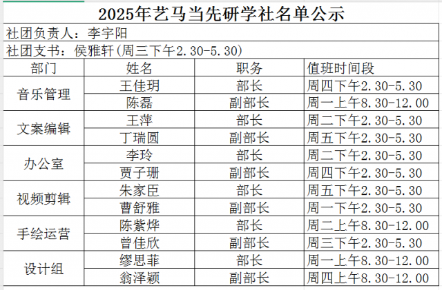 根据艺马当先研学社招新安排,经学生本人申请、指导老师审核,综合考虑各同学的申请意向、整体表现等因素,现确定社团成员名单,公示如下: