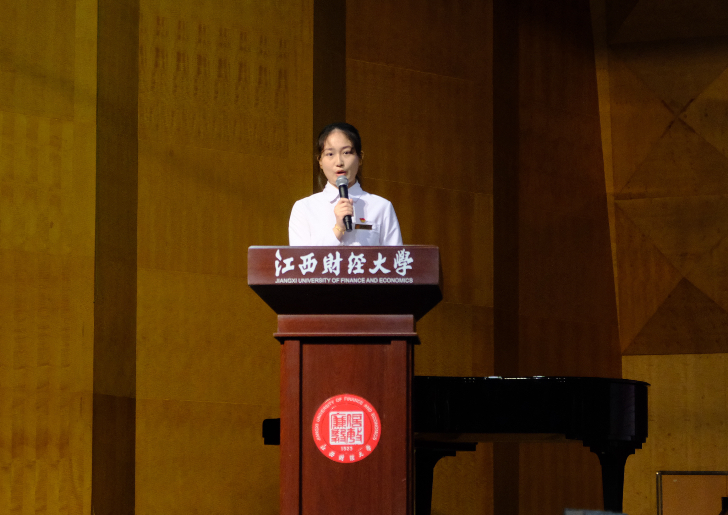 言毕,在校教师为新生佩戴校徽并合影留念。典礼最后全体师生起立,齐声高唱江西财经大学校歌。激昂的旋律回荡在音乐厅内,唱出了师生们对学校的深厚感情,也唱响了新生们开创美好大学生活的坚定信心。在恢弘的校歌声中,开学典礼部分圆满落下帷幕。