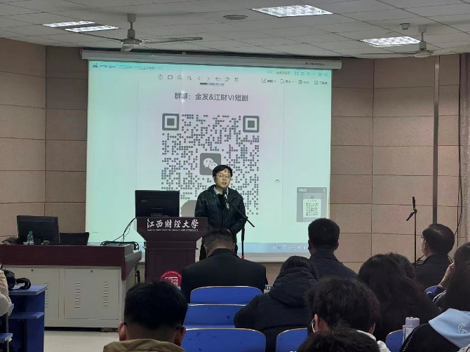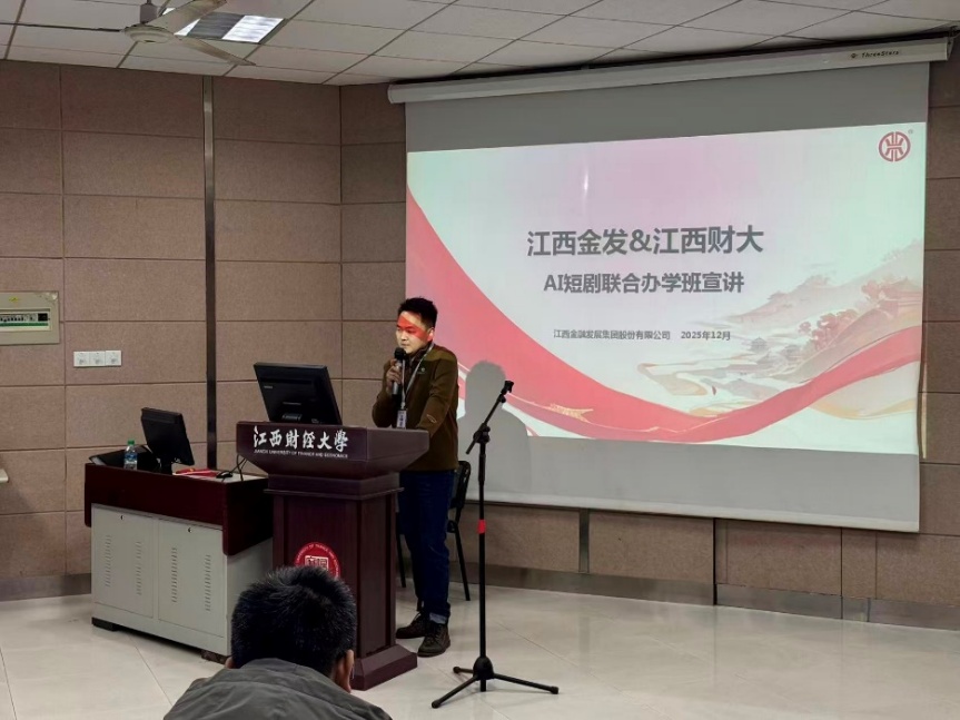 院长发言结束后,江西金融发展集团文演产融事业部总经理邵长凯作为宣讲人,围绕 “数字时代内容创作与职业新机遇” 主题展开深度分享。邵总首先介绍了江西金融发展集团的核心业务布局,重点阐述了文演产融事业部在文化产业与金融资本融合领域的探索成果,以及文演世界作为AI短剧创作与运营核心平台的资源优势。“集团始终聚焦数字文化产业创新发展,依托雄厚的资本实力和行业资源,构建了从 AI 技术研发、内容创作到市场发行的全产业链生态,目前已在 AI 短剧领域实现规模化产出和商业化突破。”
