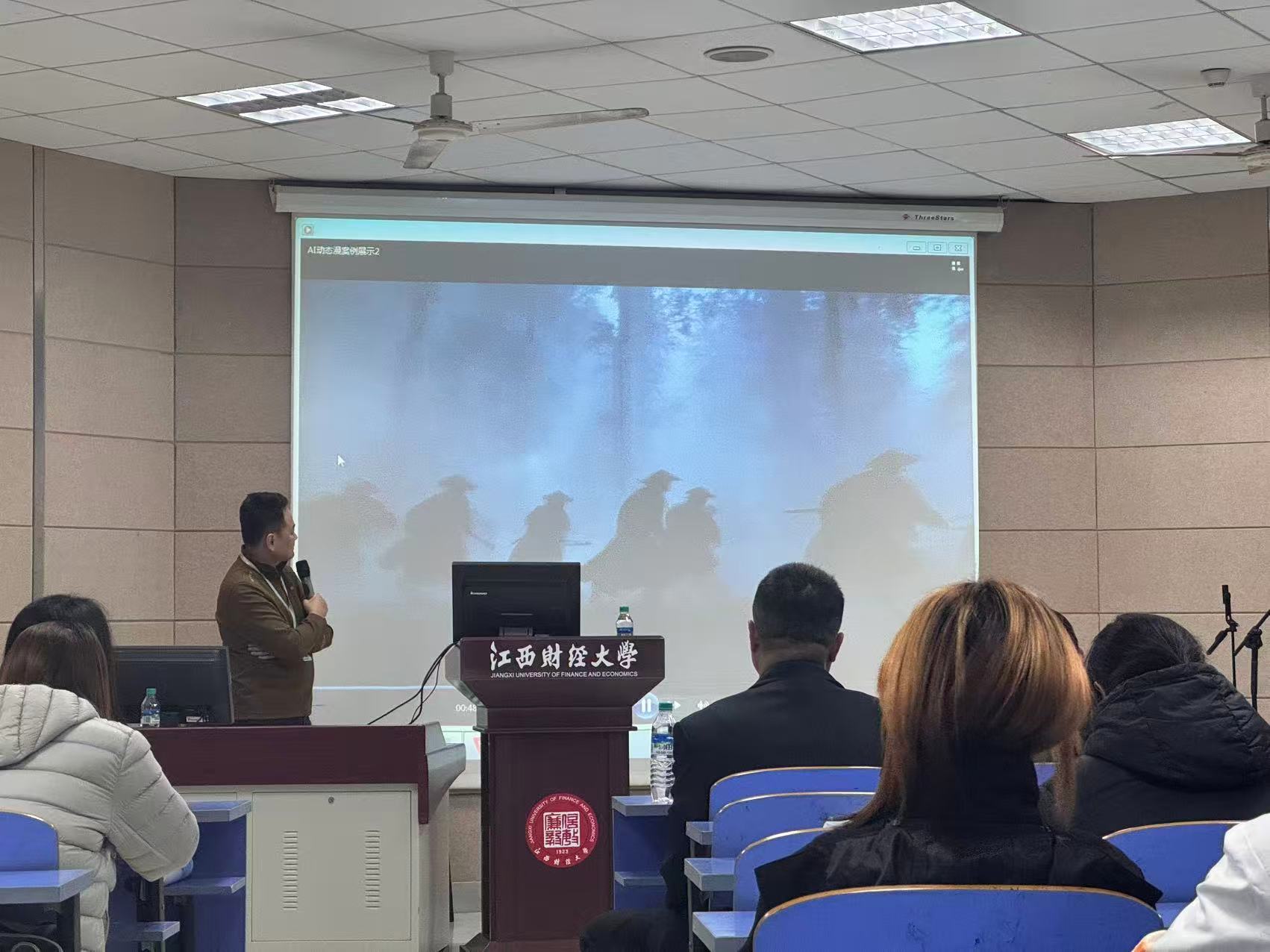 2025年12月3日,我院“数字时代内容创作与职业新机遇” AI短剧联合办学班宣讲会在学院C185教室隆重举行。本次宣讲会由学校就业专员谭宏老师主持,以校企强强联合为核心,聚焦 AI 技术与内容创作的深度融合,旨在为学生搭建前沿实践平台,培养适应行业发展的复合型人才。我院院长李民出席会议并发表主旨发言,江西金融发展集团股份有限公司文演产融事业部总经理邵长凯(宣讲人)、文演世界总经理张雷、人力资源部总经理樊国梁及企业工作人员万志辉、吉凤娟、刘自鑫,学校相关院系负责人及数百名师生共同参与了此次活动。