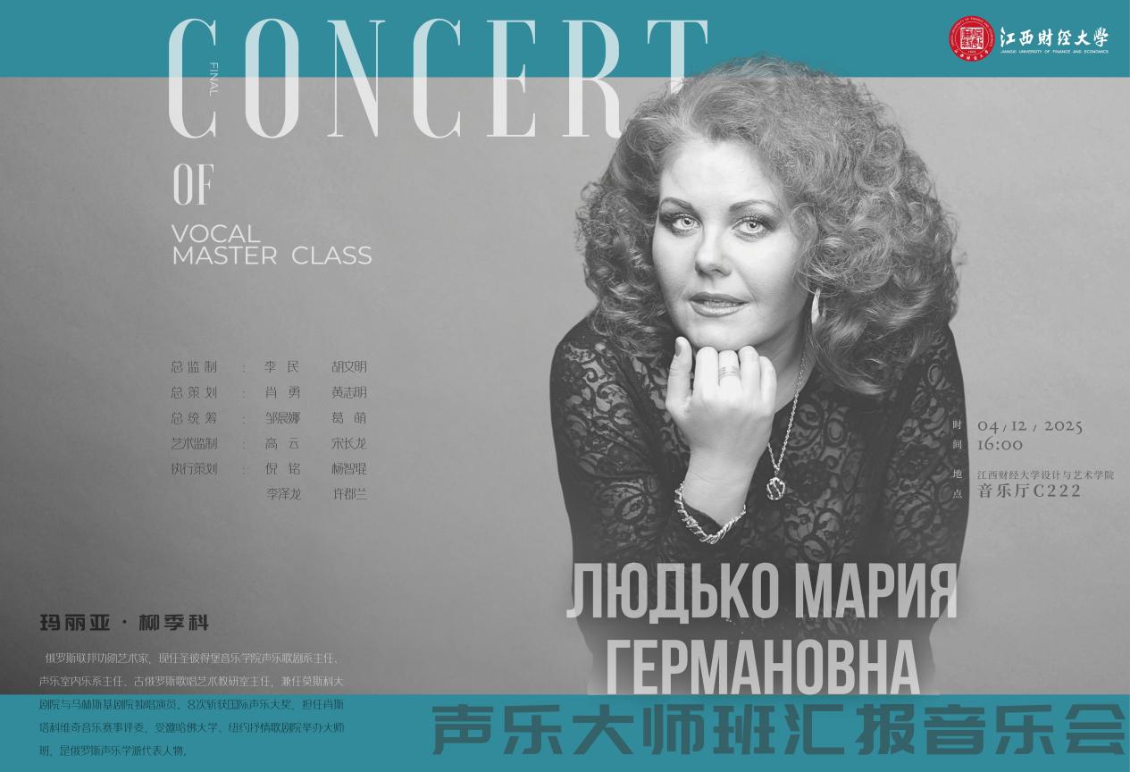 为深化声乐学科建设的国际化内涵,系统引介当代俄罗斯声乐学派前沿教学法,江西财经大学设计与艺术学院于2025年11月30日至12月5日,成功主办了“玛丽亚·柳季科教授国际声乐大师班”。本次学术活动邀请俄罗斯联邦功勋艺术家、圣彼得堡音乐学院声乐歌剧系主任玛丽亚·柳季科(Maria Lyudko)教授,通过为期一周的高强度、系统教学,最终以一场结构严谨的学员汇报音乐会完美落幕。
