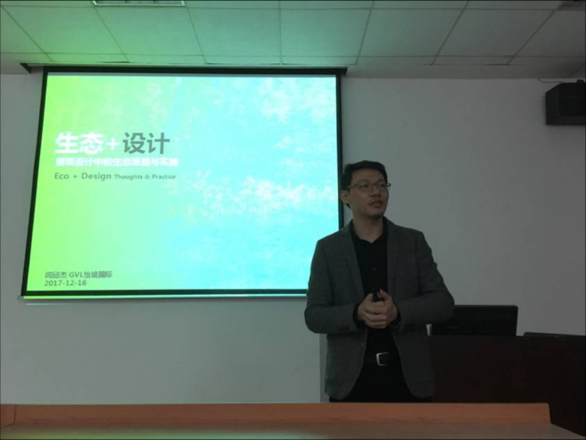 12月16日晚上7点20分,应设计与艺术学院诚挚邀请,GVL怡境国际设计集团,设计总监/研究中心负责人/美国注册景观设计师、华南理工大学和广州美术学院的客座教授闾邱杰先生。闾教授在设计与艺术学院C315教室进行了题为《生态+设计――景观设计的生态思维》的演讲。相关专业的研究生、本科生和部分教师共同聆听了讲座。