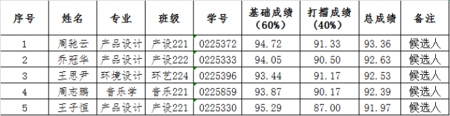 根据本科生国家奖学金评审工作安排,经过学生本人申请、学院评审委员会审核,综合学生加权成绩、附加分和现场打擂表现,拟确定设计与艺术学院国家奖学金候选人名单为:周驰云、乔冠华、王思尹、周志鹏、王子恒。现将我院2024-2025学年本科生国家奖学金候选人综合成绩公示如下:
